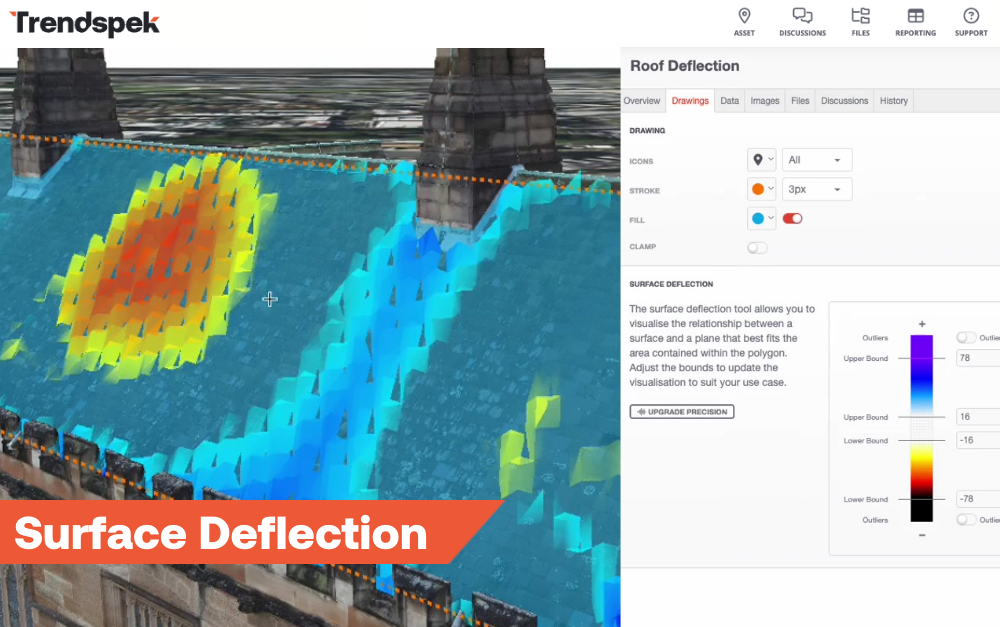 Trendspek's Roof Deflection Tool allows you to quickly identify sagging and deviated sections of a structure, accurate up to the millimetre. These defects can be readily exported into interactive reports to share with engineers to immediately plan remediation work.