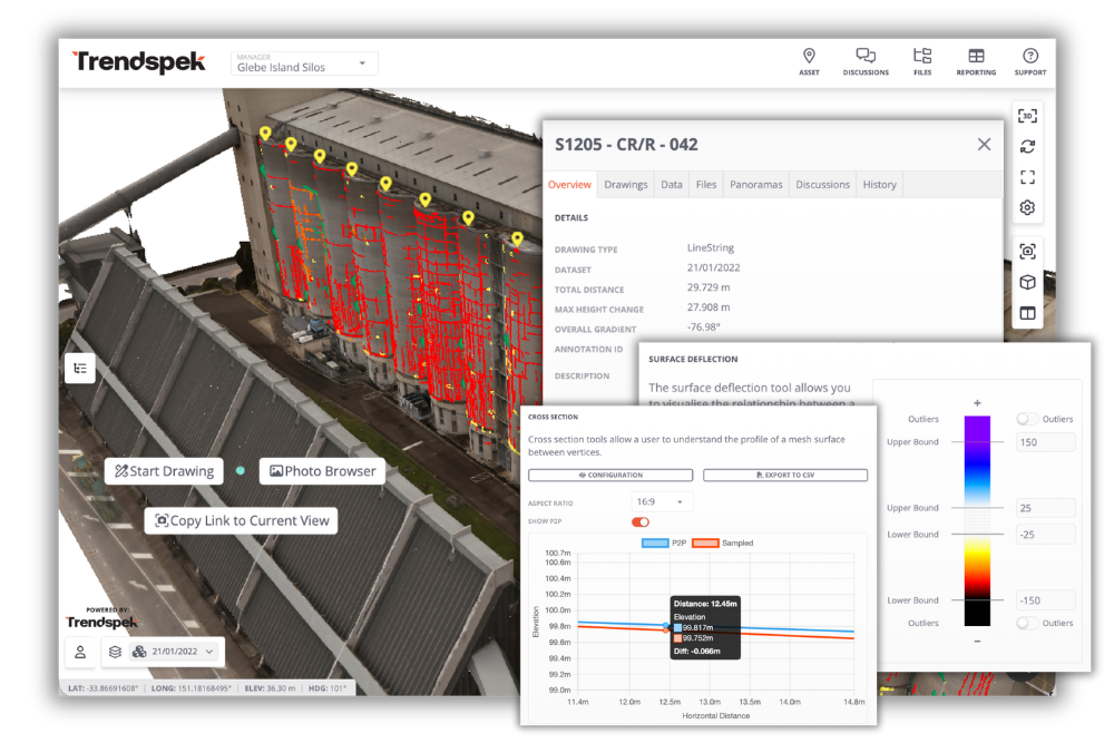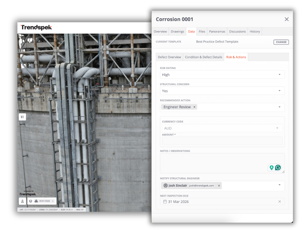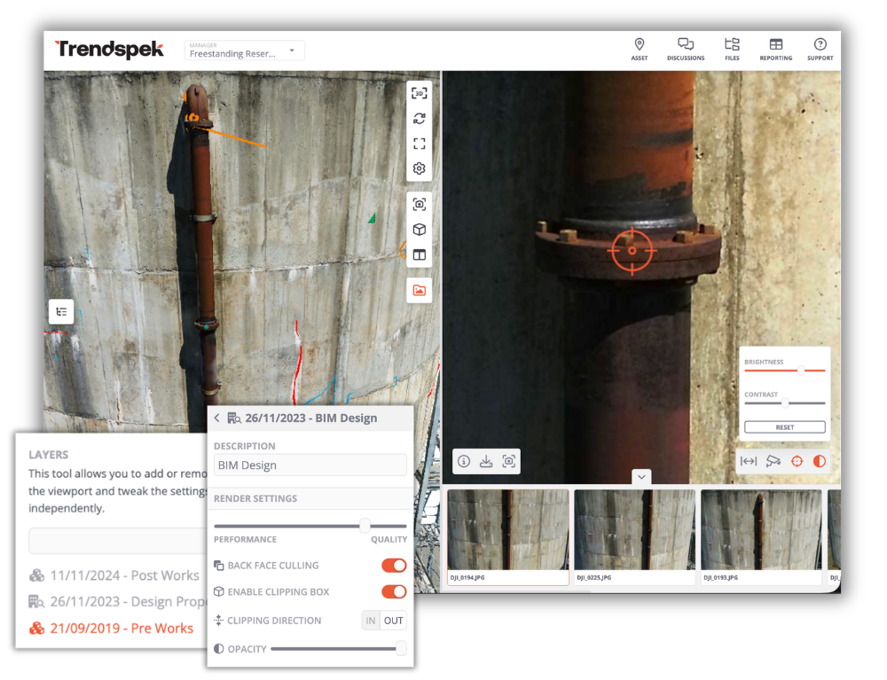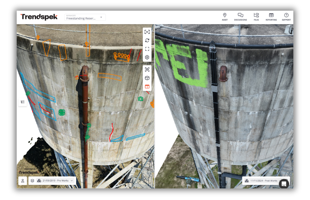 A viewer lets you look at a model; Trendspek is the operational layer underneath. It connects inspection data to reporting templates, planning workflows, remediation scoping, monitoring and portfolio insights. The 3D model is how teams interact with the record.